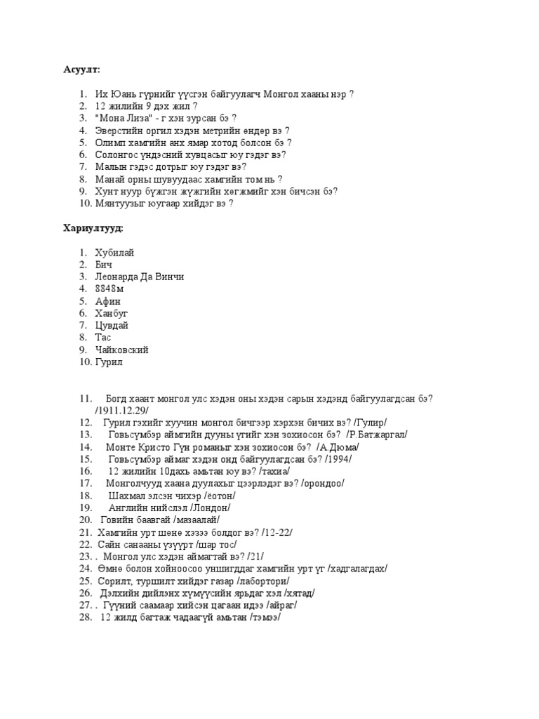 aris-asuult.docx from imgv2-2-f.scribdassets.com Гоц ухаантай хүмүүс л бүгдэд нь хариулж чадна. Over the time it has been ranked as high as 243 599 in the world, while most of its traffic comes from mongolia, where it reached as high as 169 position. Видео asuult taanar dandaa asuudag asuultiig hariuuli канала takuma mini. See more of asuult sambar on facebook. Ene haalga erdenesiin haalga mon uu gj nuguu hamgaalagchaas chini asuuwal tiim gj heleh uu ? 5 зөв үг монгол тоглоом mongol. Asuult.net is an android developer that currently has 3 apps on google play, is active since 2011, and has in total collected about 700 thousand installs and 2 thousand ratings. Asuult taanar dandaa asuudag asuultiig hariuuli.
